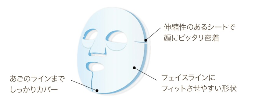 薬用保湿成分「ヘパリン類似物質」と、薬用美白※3成分「プラセンタエキス」の2つの薬用成分に加え、輪郭を引き上げながら密着できる伸縮形状の3層構造シートを採用。たっぷりの保湿美容液を角層すみずみまで浸透させ、肌全体にうるおいを届けます。