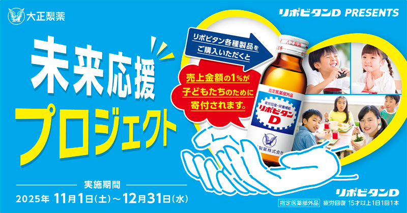 大正製薬株式会社[本社:東京都豊島区 社長:上原 茂](以下、当社)は、株式会社ツルハホールディングスご協力の下、北海道・東北・中国・静岡・四国エリアの同社・ツルハドラッグ、ウォンツ、ドラッグストアウェルネス、杏林堂薬局、レデイ薬局各店舗における、リポビタン各種製品の売り上げの一部を寄付する「子どもたちのみらいのために 未来応援プロジェクト2025」を11月1日(土)より実施いたします。
