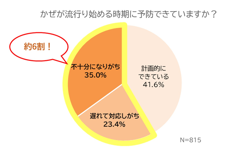 しかし、かぜ予防を実施している方でも、約6割の方が予防が「遅れがち」、又は「不十分になりがち」と回答しました。