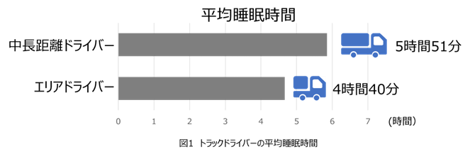 中長距離トラックドライバーの平均睡眠時間は5時間51分、エリアドライバーの平均睡眠時間は、4時間40分でした(図1)。2023年に厚生労働省が「健康づくりのための睡眠ガイド2023」を公表し、成人の睡眠時間は6時間以上を目安にすることが推奨されました。本調査結果からも、トラックドライバーの睡眠時間が不足しがちである可能性があります。