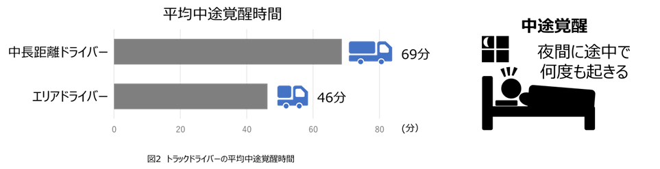 さらに、トラックドライバーの中途覚醒時間について、解析を行いました。中途覚醒時間は睡眠中に目が覚めて起きている時間を示しています。中長距離トラックドライバーは、中途覚醒時間が平均69分であり、エリアドライバーの中途覚醒時間は平均46分でした(図2)。本調査結果において、エリアドライバーよりも中長距離トラックドライバーの方が、中途覚醒時間が長いことが分かりました。