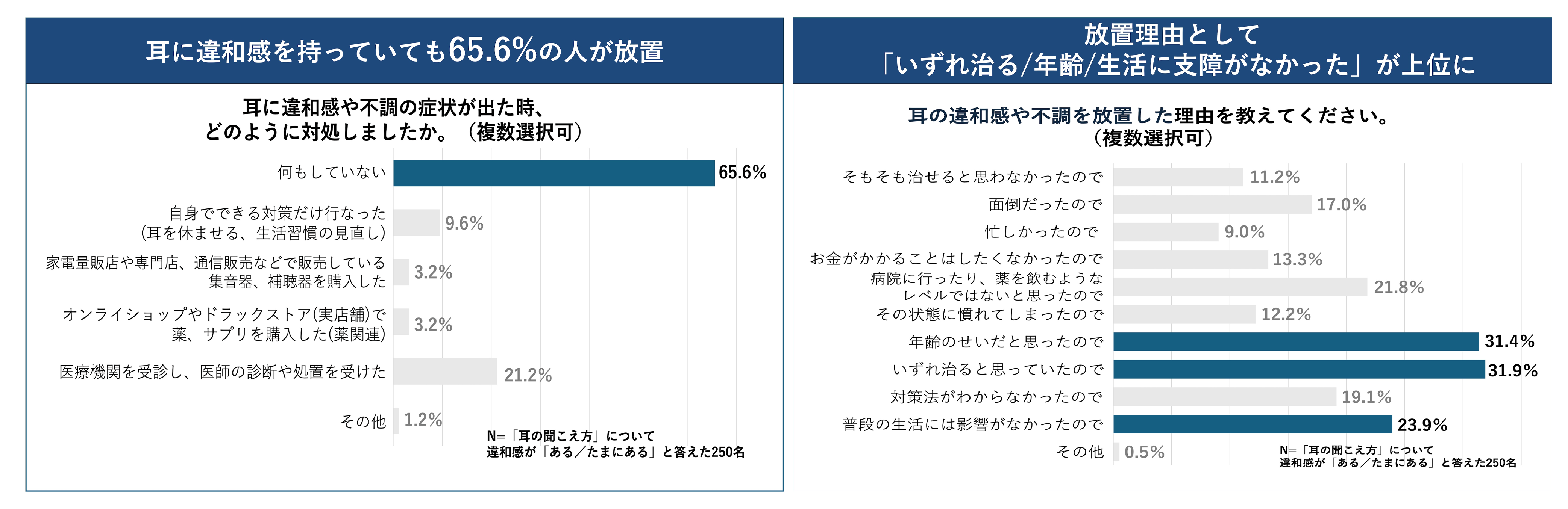調査の結果、4人に1人が耳の不調を経験していることが明らかになりました。さらに耳に違和感や不調を感じたにも関わらず、放置したことがある人は65.6%にのぼり、耳は目や歯と比べて定期健診の受診率も低く、日常的なケアの意識が低いことが明らかになりました。