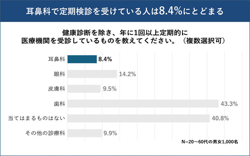 健康診断を除き、年に1回以上定期的にどの医療機関を医療受診しているかを尋ねたところ、「歯科」は43.3%、「眼科」は14.2%の人が回答。一方で、「耳鼻科」を受診している人は8.4%にとどまりました。耳は変化がわかりにくく、目につく場所でもないことから、目や歯に比べて定期的な検診は必要ないと考え、ケアが後回しにされる傾向があることがうかがえます。