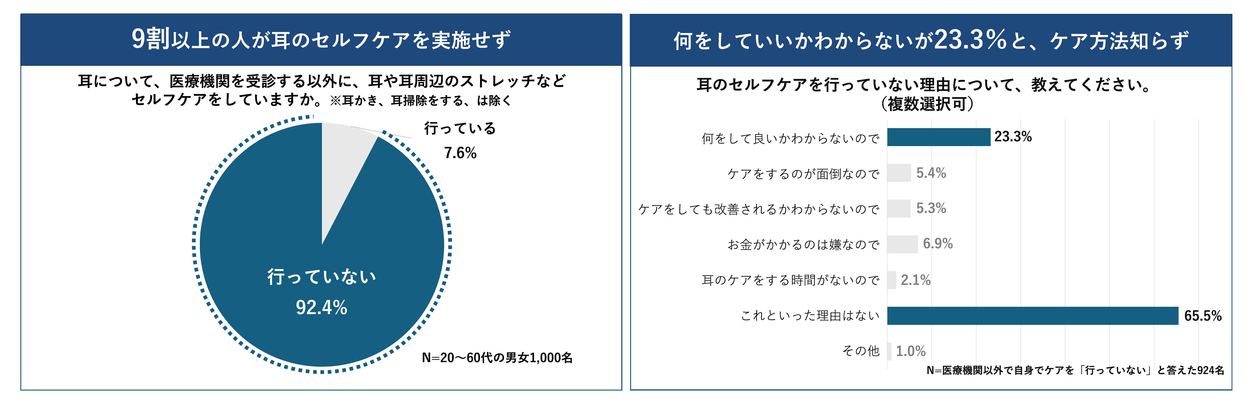 また、行っていない理由を聞くと、「特に理由はない」が65.5%、「何をしていいかわからない」が23.3%と、耳に対して無関心な人が多いだけでなく、自覚やケア方法がわかりにくいことも背景にあることが明らかになりました。