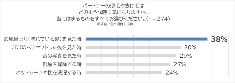 さらに、「パパの薄毛・抜け毛がどのような時に気になったのか」をお聞きしたところ、「お風呂上がり(濡れている髪)を見た時」が38%と最も多く、「ヘアセット後」「昔の写真を見たとき」などの回答が続き、ふとした瞬間にパートナーの薄毛や抜け毛が気になっていることがわかりました。