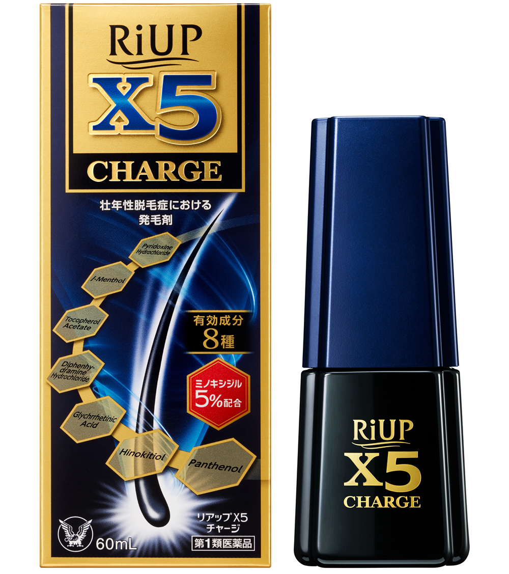 リアップX5チャージは、発毛成分ミノキシジル5%を配合し、壮年性脱毛症における抜け毛の進行予防サポート成分6種に加え、育毛サポート成分「パンテノール」も配合した発毛剤です。新たに毛を生やす「発毛」の効果だけでなく、今ある髪の毛や新たに生えてきた毛を育てる「育毛」の効果、そして抜けにくくする「抜け毛の進行予防」 といった効果が期待できます。