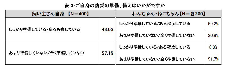 「ご自身の防災の準備、備えはいかがですか」と尋ねたところ、「あまり準備していない」(38.3%)※、「全く準備していない」(18.8%)※を合わせた半数以上の飼い主さん(57.1%)が準備をしていないと回答。そのうち9 割以上(91.7%)がわんちゃん・ねこちゃんの防災の備えもしていないことが明らかになりました。 ※ 表2 参照