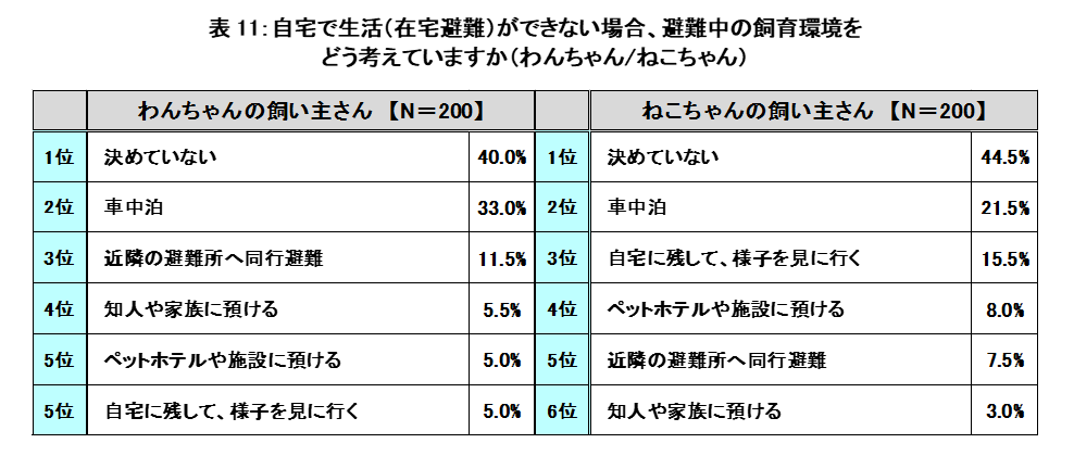 「自宅で生活(在宅避難)ができない場合、避難中の飼育環境をどう考えていますか」と尋ねたところ、「決めていない」という回答が42.3%と最も多く4 割以上を占めています。2 位の「車中泊」は約3 割(27.3%)が回答、3 位は「自宅に残して、様子を見に行く」(10.3%)という結果になりました。わんちゃんは「近隣の避難所へ同行避難」(11.5%)が3 位で、一緒に避難したいという飼い主さんが多い一方、ねこちゃんは4 位に「ペットホテルや施設に預ける」(8.0%)など、安心できる環境を確保してあげたいと考える飼い主さんが多いことが分かりました。
